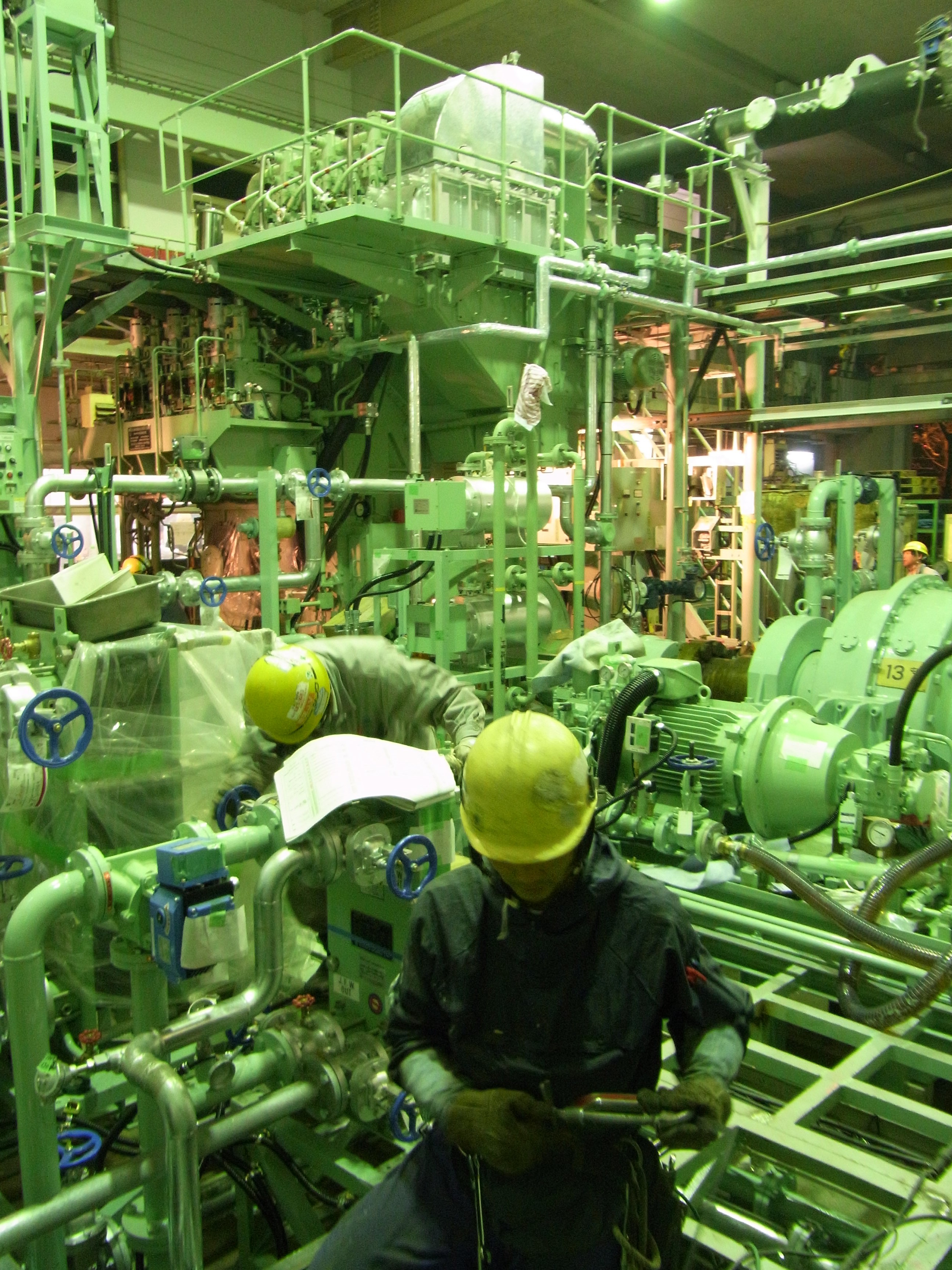 さて今回書き込ませてもらいました仕事の内容は、ディーゼルエンジンの水、油圧、エアーなどの配管工事になります。今回はすべて溶接でとの指定付き!これがなかなか大変な作業でした。私たちは配管を切って溶接する作業だけだったのですが、やり始めていくうちに工場の中が配管だらけに・・・・全てのパーツを仮止めしたときにはすでに足の踏み場がない状態に!そして次は本付け作業!!やってもやっても終わる気がしません。最後の方は夢の中でも溶接作業していました(笑)